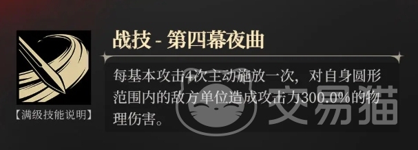 诺亚奈蒙特的战技叫做第四幕夜曲,在战斗中每当她完成4次基本攻击后,就可以主动触发这一强大的技能,一旦激活,第四幕夜曲就会以诺亚奈蒙特为中心,对自身圆形范围内的敌方单位造成高达300%攻击力的物理伤害。