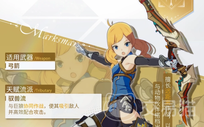 神射手是一个非常适合新手玩家的职业,操作简单并且伤害不俗。这是一个超远距离攻击的职业,因此在战斗时神射手是非常灵活的,可以通过位移,尽可能地规避来自敌人的伤害,同时也能够寻找到最佳的攻击角度,对敌人发起致命一击。而当场上的战斗形式处于劣势时,神射手也可以利用自己的特性,迅速脱离战场,等待下一次的进攻。她使用弓箭作为武器,一共有两个流派,分别为驭兽流和训鹰流。