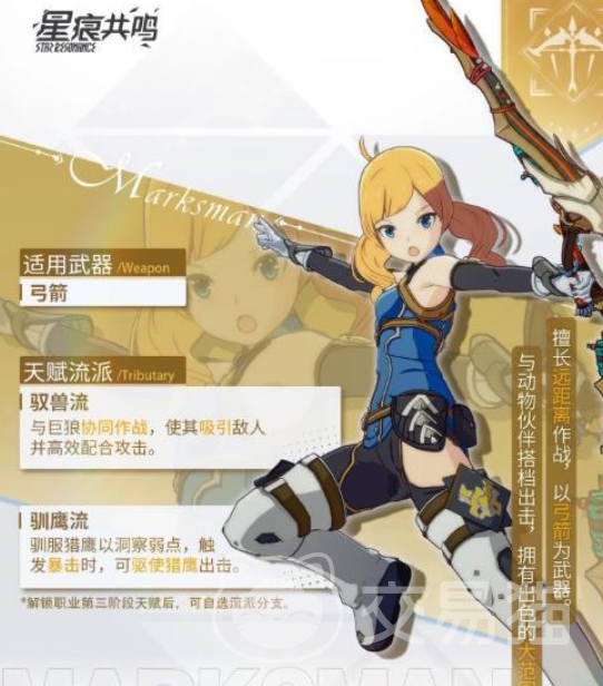 神射手是游戏里比较偏向于远程攻击的一个职业,这个职业后期可以进化成驭兽流,在这个流派里玩家可以直接和巨狼一起战斗,巨狼可以在游戏里吸引对方的注意,同时和玩家配合作战,也可以选择进化成驯鹰流,这样玩家就可以驯服猎鹰,并且在对战的时候让猎鹰观察对方的缺点,也是一个可以用宠物来帮助自身战斗的流派。