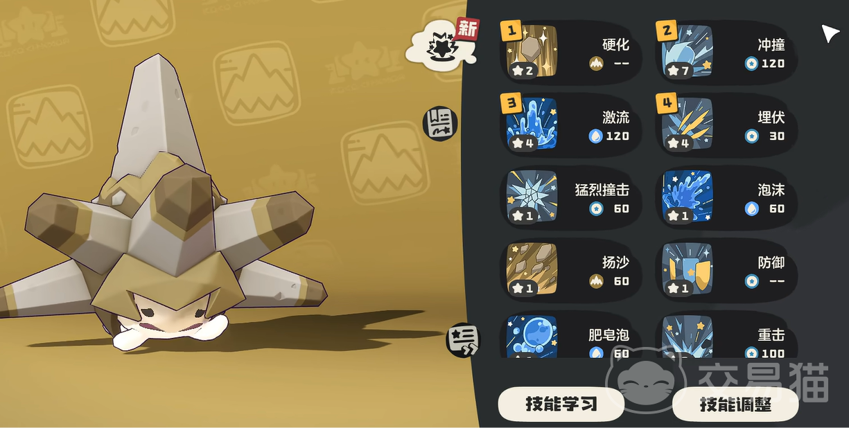 其实他的土属性技能很多,这里推荐大家搭配硬化,可以直接提升他的防御力。但他可以为其他队友承担更多的伤害,另外还有扬沙可以造成范围伤害,一次性攻击多个敌人。还有一些水属性技能,例如激流或者泡沫,都是带有伤害的控制技能。如果对方的攻击太强的话,可以带一个防御,轻松抵挡大量输出。