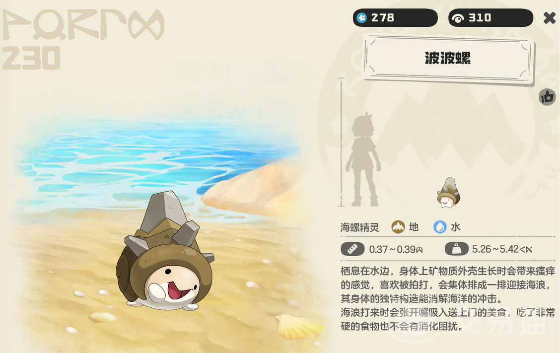 其实这是一种螺类生物,只不过他的贝壳被替换成为石头了,所以由此可见,这大概是个石属性的精灵。即便整日生活在沙滩以及海洋中,它的性格依旧开朗阳光。笑容时常浮现在他的面庞上。由于他身上有着瘙痒的感觉,所以喜欢躺在沙滩上被海浪拍打。