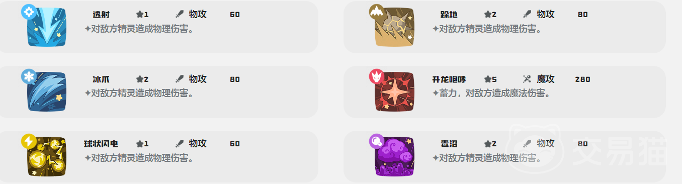 另外也能学习透射,能够无视防御,造成更高物理伤害。对方的精灵数量较多,那就可以学习跺地,能够造成群体范围伤害。要是对方比较畏惧毒的话,那就可以学习毒沼,可以造成范围毒属性伤害,并削减治疗效果。