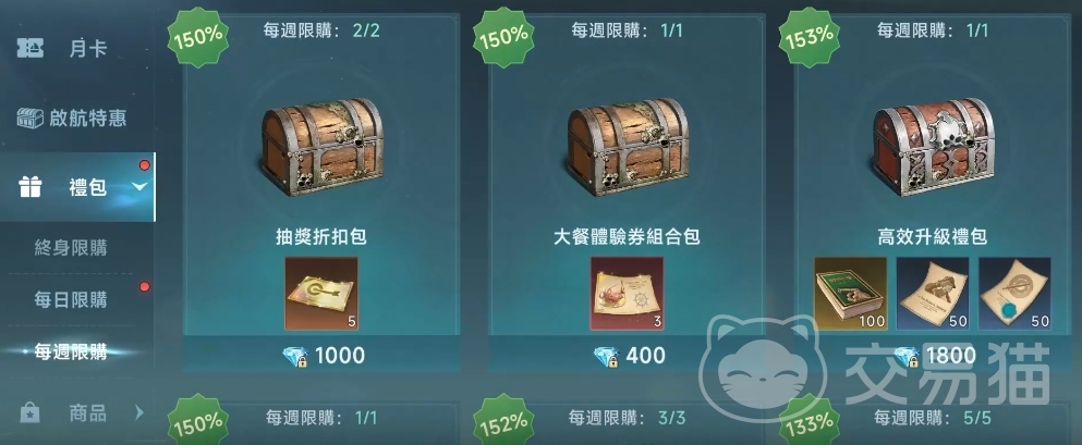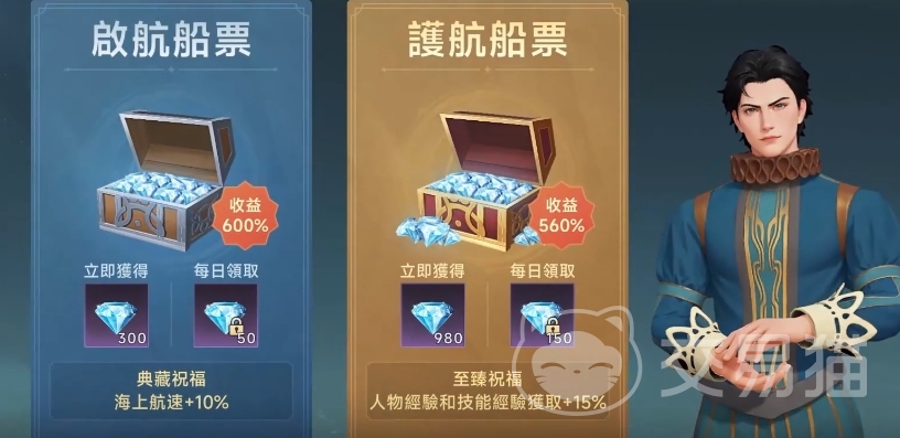 月卡往往是首当其冲的,目前游戏内主要是两种不同的月卡,一种是增加航行速度,另一种则是增加经验获取速度。玩家在成功购买月卡后,每天都可获得钻石以及航速、经验加成等多种,在性价比方面还是极高的,往往是氪金的首选之一。