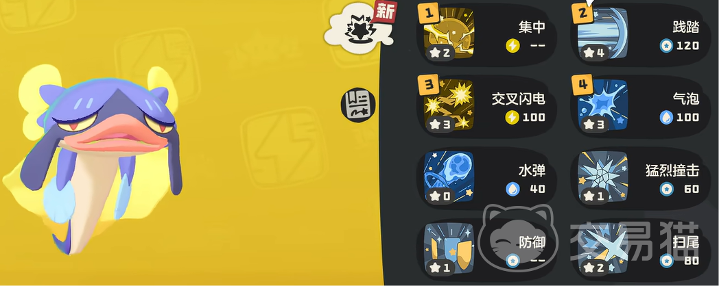 它的特性叫做生物电,可以让他的电系技能直接减少3点能耗,这是一个特别强的特性,因为可以更频繁的用出强大的能力。他的技能叫做水弹,可以造成魔法伤害。另外还有猛烈撞击,能够通过身体的碰撞造成物理输出。
