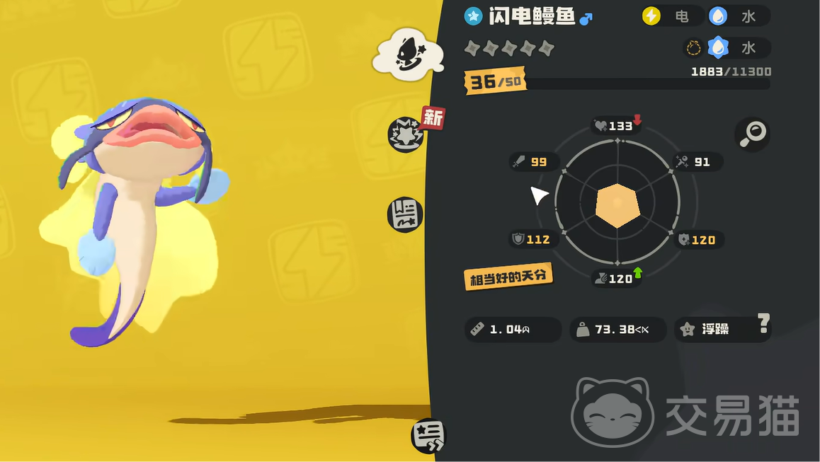 当你的胆小鳗鱼达到36级之后就可以进化了,接着就可以拥有一只闪电鳗鱼。闪电鳗鱼属于水属性,电属性的精灵。不过他的防御力以及生命值较低,但是魔法值以及物理攻击更高。所以由此可看出他是一个主力输出角色,培养时要注重提升攻击力。
