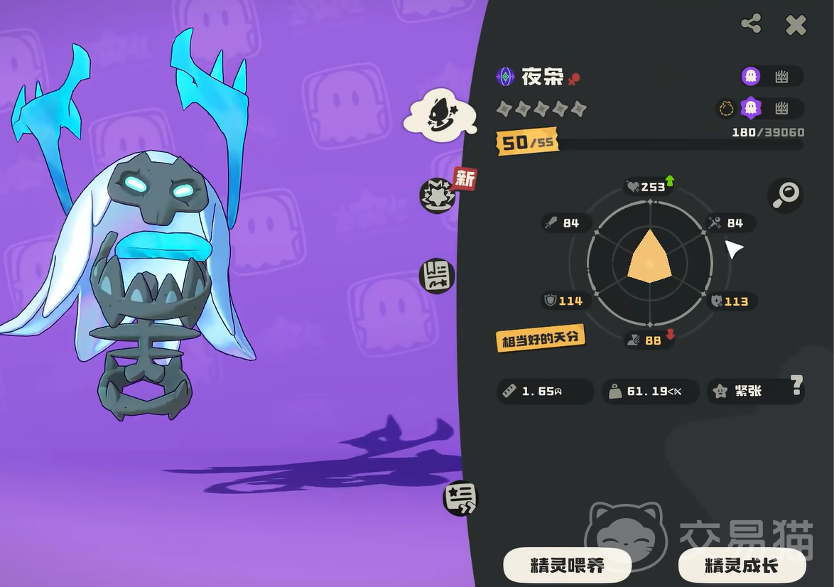 接着再来看一下它的基础属性,他的天分其实特别好。然后生命值高达253点,虽然法力值没那么高,但是伤害依旧不可低估。然后它是一只幽灵属性的精灵,平常比较克制一些光明属性的精灵,可以将其派遣至场上,然后就能起到出其不意的作战效果。