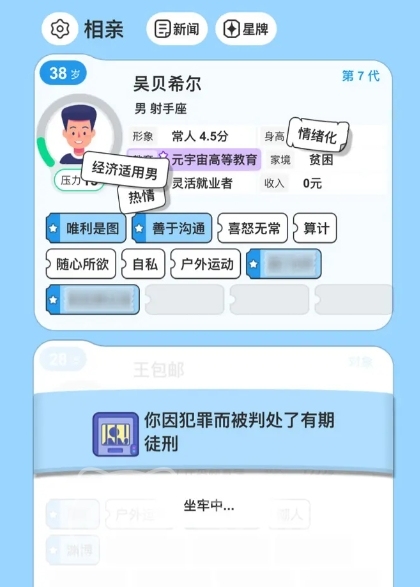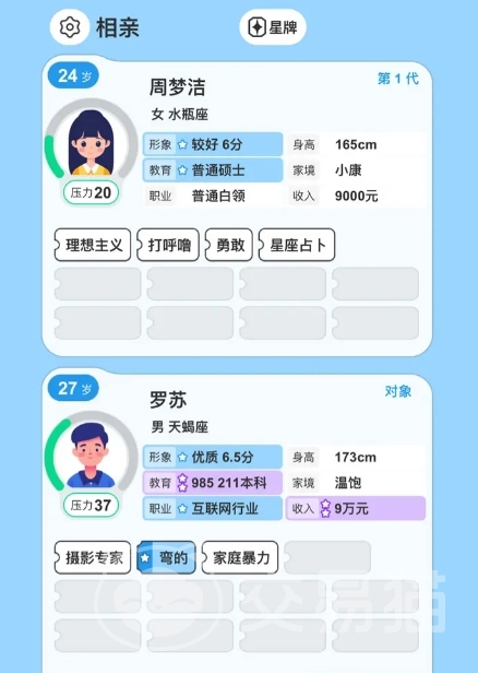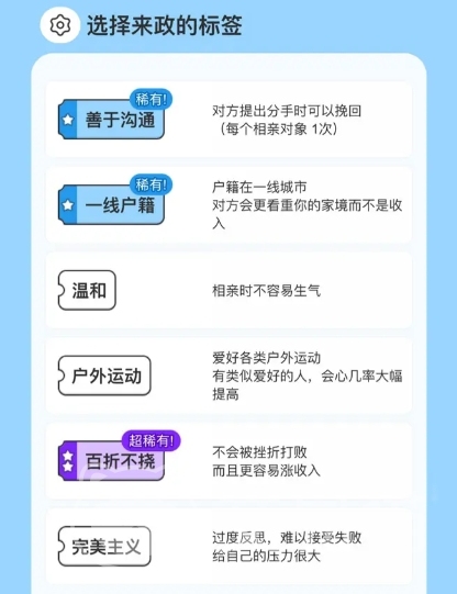 同时,大家也得隐藏一些负面标签,像迷信观念,亦或是身体隐患等都是需要这样操作的,当然到时候也可以主动去购买婚介所会员卡,这样也能去进一步增加自身游戏内相亲效率。