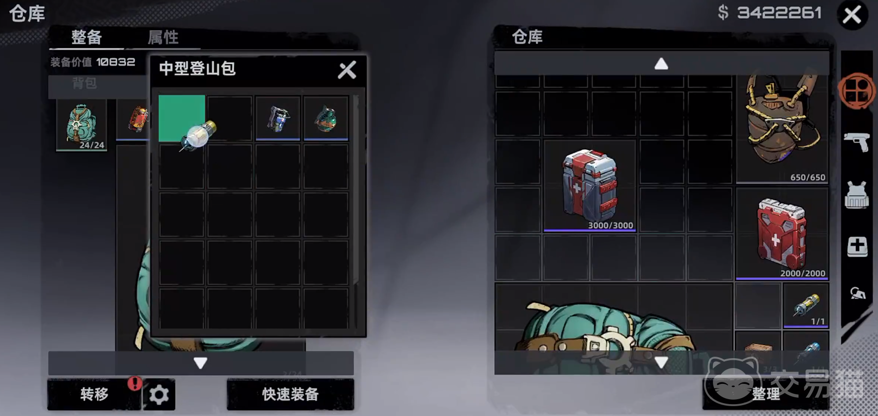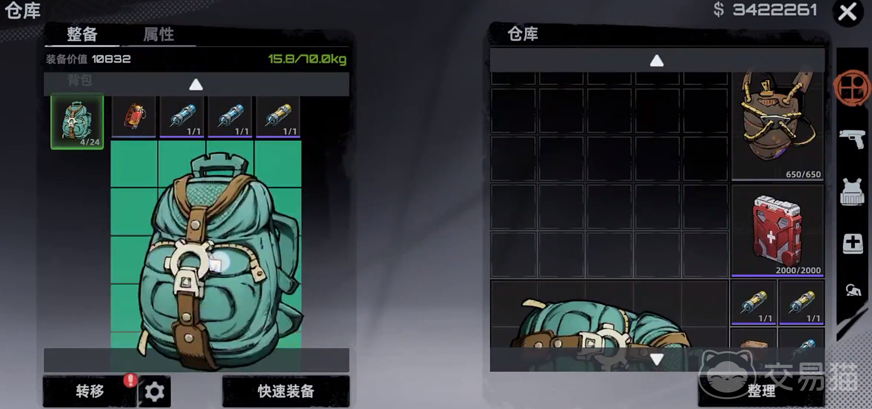 之后大家继续这个套路,将已经整理好的背包继续放回仓库当中。然后再将自己的装备栏中所拥有的材料或者其他道具继续放入仓库里,然后再将仓库里的某个背包放入整备栏中。