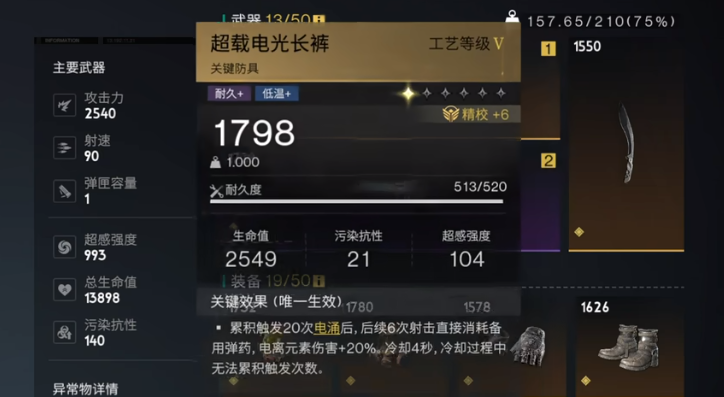 关键装备的话,大家可以装配超载电光长裤。这是一件强度很高的装备,当触发多次电涌之后,就可以消耗所有的弹药。并增加电离元素的伤害,进一步提升输出。