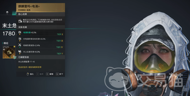 接着面罩上的模组,可以用麒麟雷鸣<电涌>。这个同样是可以用来增加电涌伤害的模组,词条后缀的话跟之前的一样就行。至于上衣方面,大家可以直接使用末土套装。对于模组词条来说,优先级最高的自然是坚盾庇护<月兆>。能够获得的减伤效果更好,而且还能增加输出。