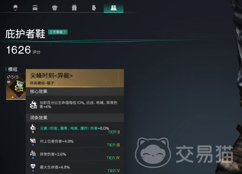 鞋子上的模组推荐用尖峰时刻<异能>,因为墨土套和尖峰时刻最搭。可以增加当前百分比生命值每低10%,近战、枪械、异常伤害+4%,让输出进一步加强。