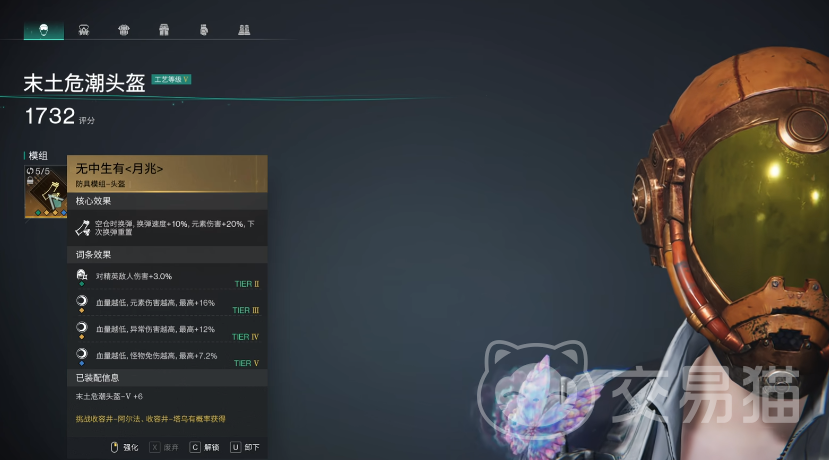 至于头盔模组的话,这里推荐大家使用无中生有。然后优先使用月兆后缀的模组,然后词条优先级依然是选择元素异常,另外还有上位。优先去追这三个词条就行,如此就能够打出更高的元素伤害。