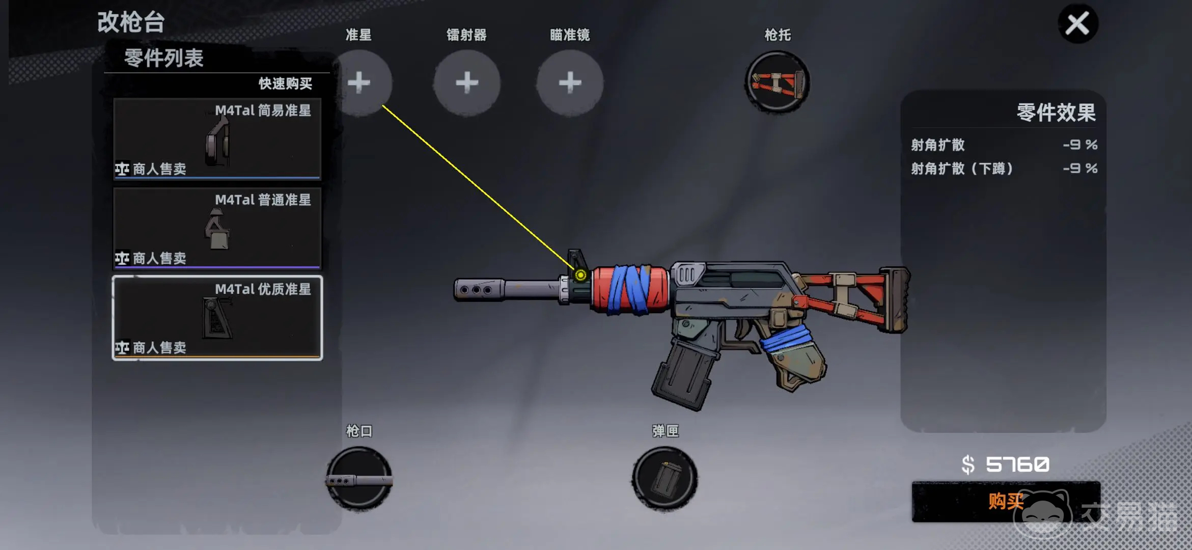 至于零件方面的话,这里更加推荐大家用上M4Tal优质准星。如此一来就可以让玩家获得更好的准头,可以让射角扩散率减少9%,另外射角扩散也会下降9%。如此就能更精准的命中对手的软肋,至于其他零件的话,同样选择最优质的就行。
