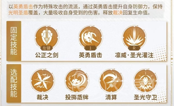 神盾骑士共有三个固定技能,分别为公正之剑、英勇盾击和圣光灌注。另外还有4个选配技能,分别为裁决、投掷盾牌、清算和圣光守卫。根据玩家自身配装和选择流派的不同,可以选择合适的技能,以便在战斗时发挥出最强的作用。