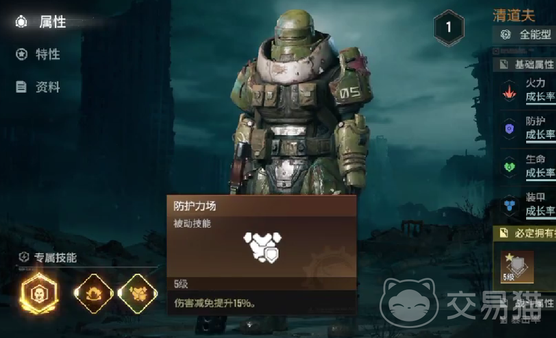 清道夫的被动技能是防护力场,若选用它作为常驻角色,团队会获取15%的伤害减免buff,从而整体性的提升自己的坦度。