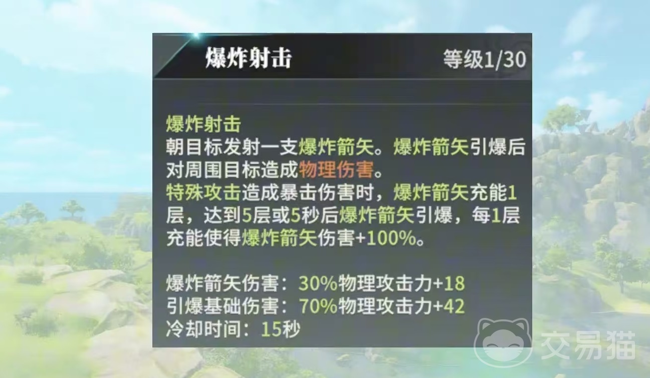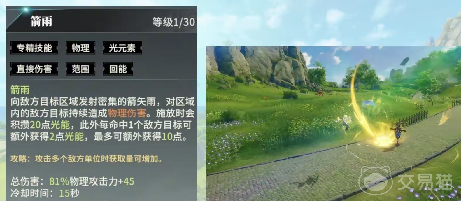 天赋方面选择狼之契约、灵能激流和三重之矢等。狼之契约可以驯养一只野狼跟随战斗,狼可以对目标进行普通攻击,也可以协同攻击,普通攻击造成40%攻击伤害,协同攻击造成250%伤害。灵能激流效果是每释放10次特殊攻击,下一次箭羽,得到的光能可提升100%。三重之矢是普攻有5%固定几率,使特殊攻击立即进行一次充能。