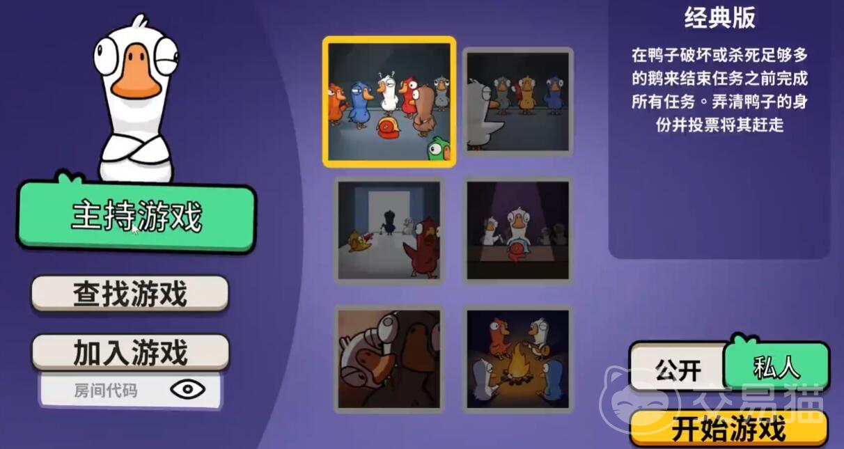 私人房间适合好友组队,公开房间则允许其他玩家随机加入。进入游戏主界面后点击“开始游戏”,选择“主持游戏”进入建房页面。在页面中可设置游戏模式(经典、轮抽等)、地图(地下室、鹅教堂等)和玩家人数(4-16人)。确认设置后点击“创建游戏”即可生成房间,系统会分配一个房间代码,分享给好友即可邀请加入。若选择公开房间,其他玩家可通过搜索功能找到你的房间。