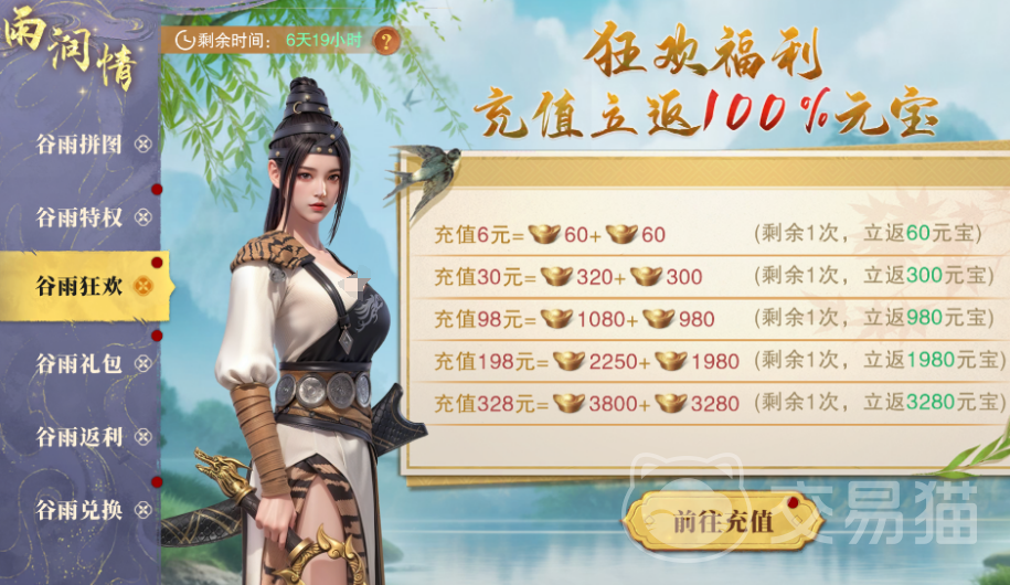 对于喜欢充值的玩家,谷雨狂欢活动为你提供了充值返还的机会。在活动期间,只要充值达到指定金额,即可获得等额元宝返还。这是一次难得的充值福利,不仅能加速你角色的成长,还能通过返还元宝提升你的实力。