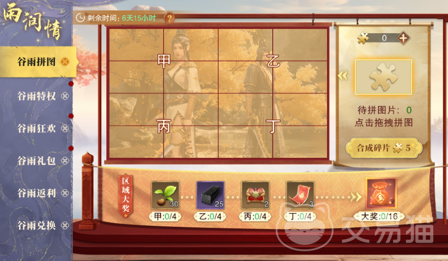 首先要介绍的是谷雨拼图活动。活动期间,玩家可以通过参与江湖历练、装备秘境和万剑冢等副本,随机掉落拼图碎片。收集到一定数量的拼图碎片后,可以合成完整的拼图并激活不同区域。每激活一个区域,就能获得丰厚的奖励,全部激活后,还能解锁最终大奖。这个活动不仅考验玩家的探索和勤奋,还提供了极具吸引力的奖励,绝对值得每位大侠全力参与。