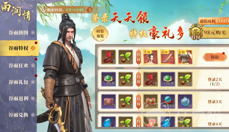 谷雨返利活动也不容错过。每当充值满30元,即可开启一次谷雨返利宝箱,宝箱内有机会开出云锦、浮屠陨铁、青木芽等珍贵材料。这些材料对于提升装备和培养角色非常重要,是每位玩家在活动期间不可忽视的福利。