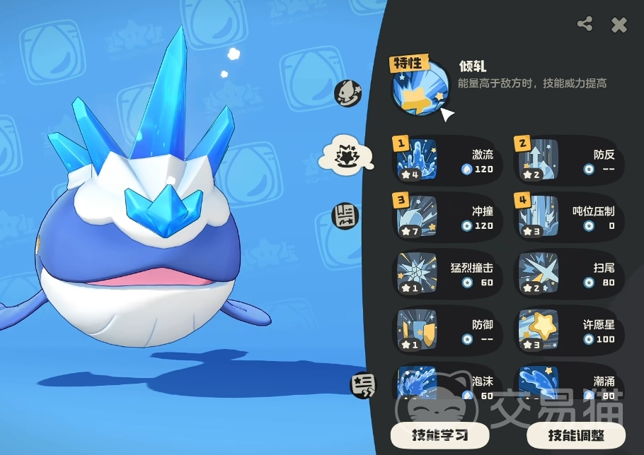 作为深海霸主,在技能上都是以水系技能为主,想要在对战中发挥出它的实力还需要对它进行技能的搭配。精灵的技能是非常多的,伴随玩家投喂升级来解锁。最为适合深海鲸的技能搭配是【防反】、【潮涌】、【水幕冲击】和【水刃】,再加上精灵本身的特性,能在能量值高于对手时在释放技能时有更好的效果。