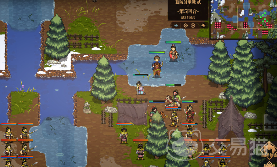 最后兵种之间也是存在着克制关系的,步兵能够克制骑兵,而弓兵又能够克制步兵。并且不同的兵种在不同的场地中也能够发挥出优势,如果是在森林场景中的话,那么弓兵就能够被隐蔽起来,但是如果他们在水中行走,那么移动速度又会得到大幅度的降低。
