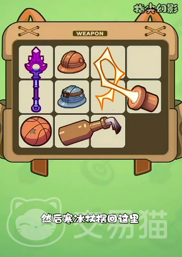 再摆上一个一级头盔,将闪电边摆放在最右边的三个格子中,之后将3级寒冰杖放置在最左侧的两个格子中,将燃烧瓶合成2级,将最后出现的1级头盔与格子中的1级头盔和2级头盔合成3级,就可以开始战斗了。