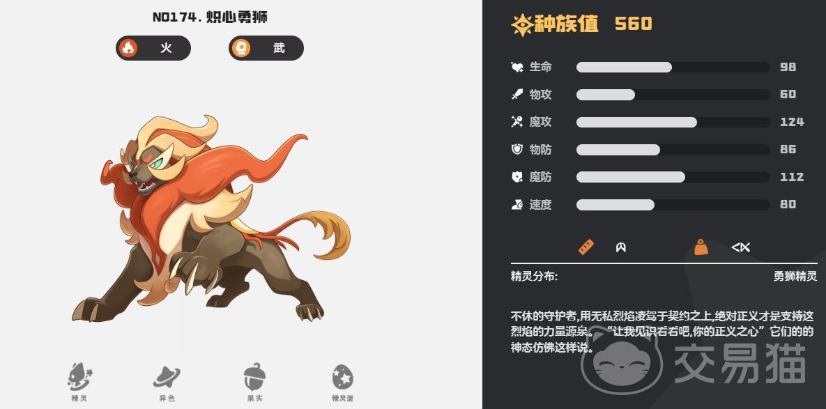 8.炽心勇狮:纯武系高爆发精灵,特性勇者之心血量越低伤害越高。技能烈焰冲锋附带灼烧效果,狮心怒可破除敌方增益。获取方式为挑战火山区域精英怪,推荐性格固执。