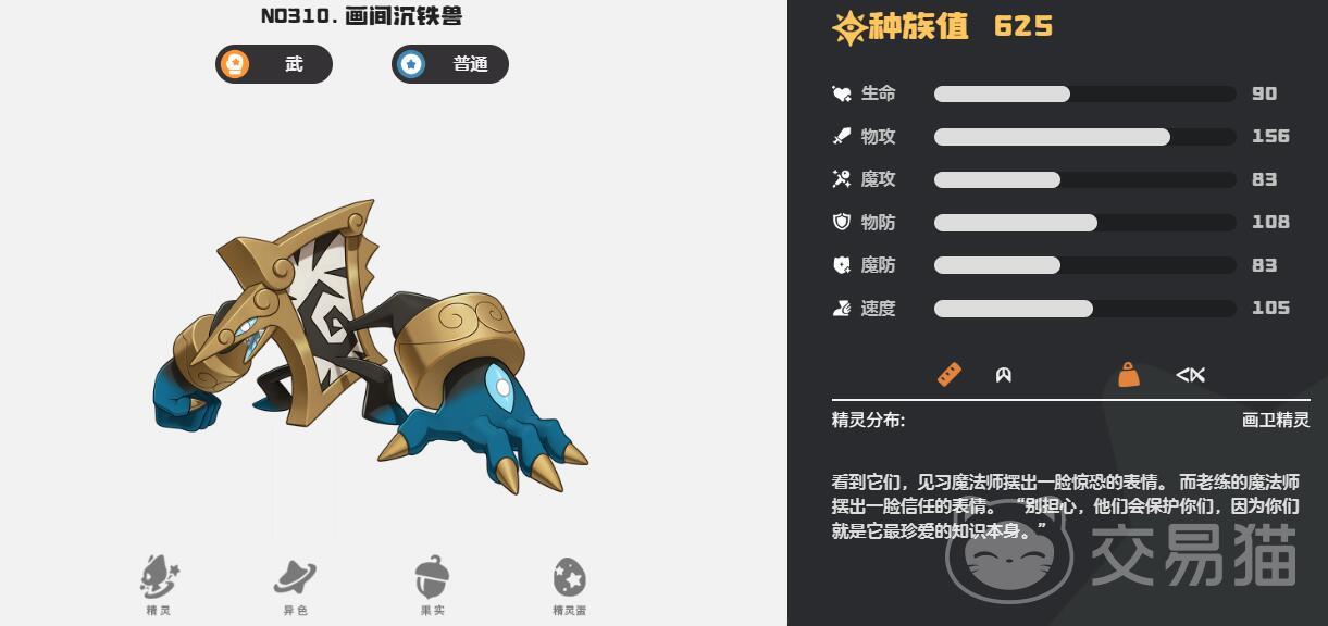 2.画间沉铁兽:作为武系与机械系双属性精灵,拥有独特的防御反击能力。技能铁壁重拳可在防御后发动强力反击,墨染冲击则能降低对手命中率。特性墨甲能减免30%远程伤害,推荐性格勇敢强化物攻。
