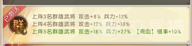 除了流血增伤,群雄阵营还擅长运用混乱和眩晕等控制手段来打乱敌方的节奏,武将们的技能不仅可以对敌人造成可观的伤害,还能附带眩晕和魅惑等效果,群雄阵营还拥有强大的阵容加成,提升数值还会跟着人数变化而提升,而当上阵5名群雄武将时,除了攻击和兵力的提升外,还会大幅提高流血概率。