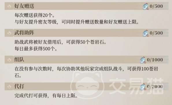 还有武将助阵玩法也会奖励苍岩石,当助战武将被好友借用之时,作为回报,自己也能获得50个苍岩石,每日最多可获得500个,这就好比是自己派出了得力的助手去帮助朋友,然后朋友给自己一份丰厚的礼物,此外在组队战斗的过程中,当自己没有参与次数时,协助其他玩家完成组队战斗,便能收获100苍岩石,代打任务完成后同样也有这份奖励。