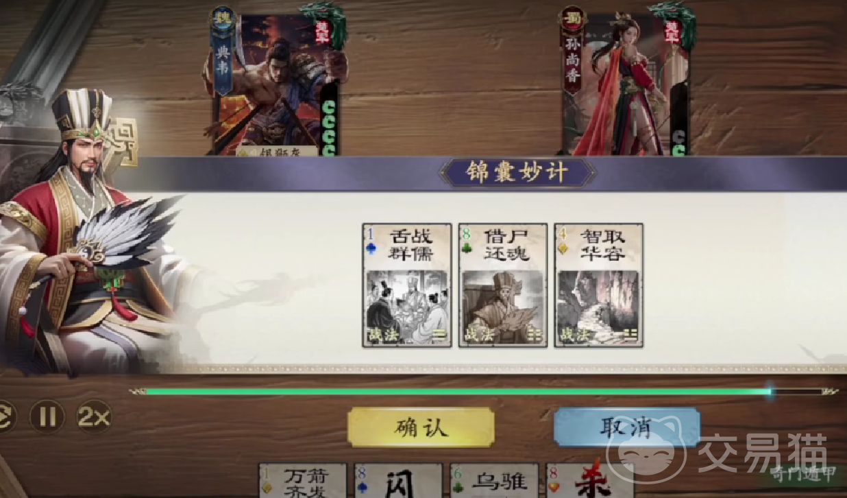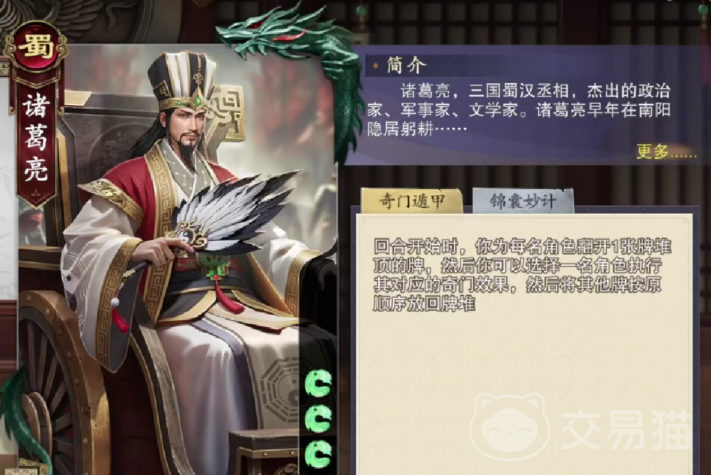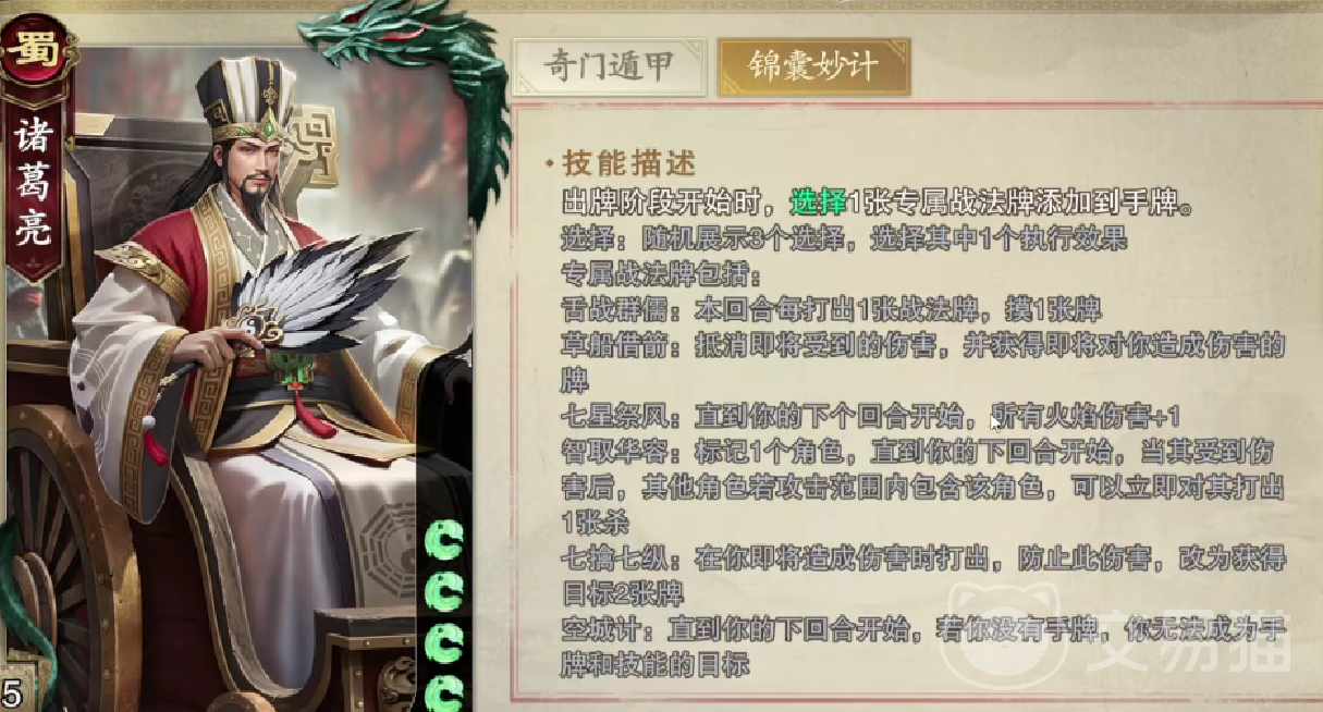 诸葛亮还具备锦囊妙计,这个是他的被动技能,当玩家开始游戏的时候,诸葛亮可以从专属战法排队当中选择一张牌。其实玩家这里要注意专属战法所涉及到的排的效果特别的多,而玩家要根据具体的局势灵活的使用,敌方可以使用空城计来自保,自己方要使用七星祭风来增强火焰伤害。