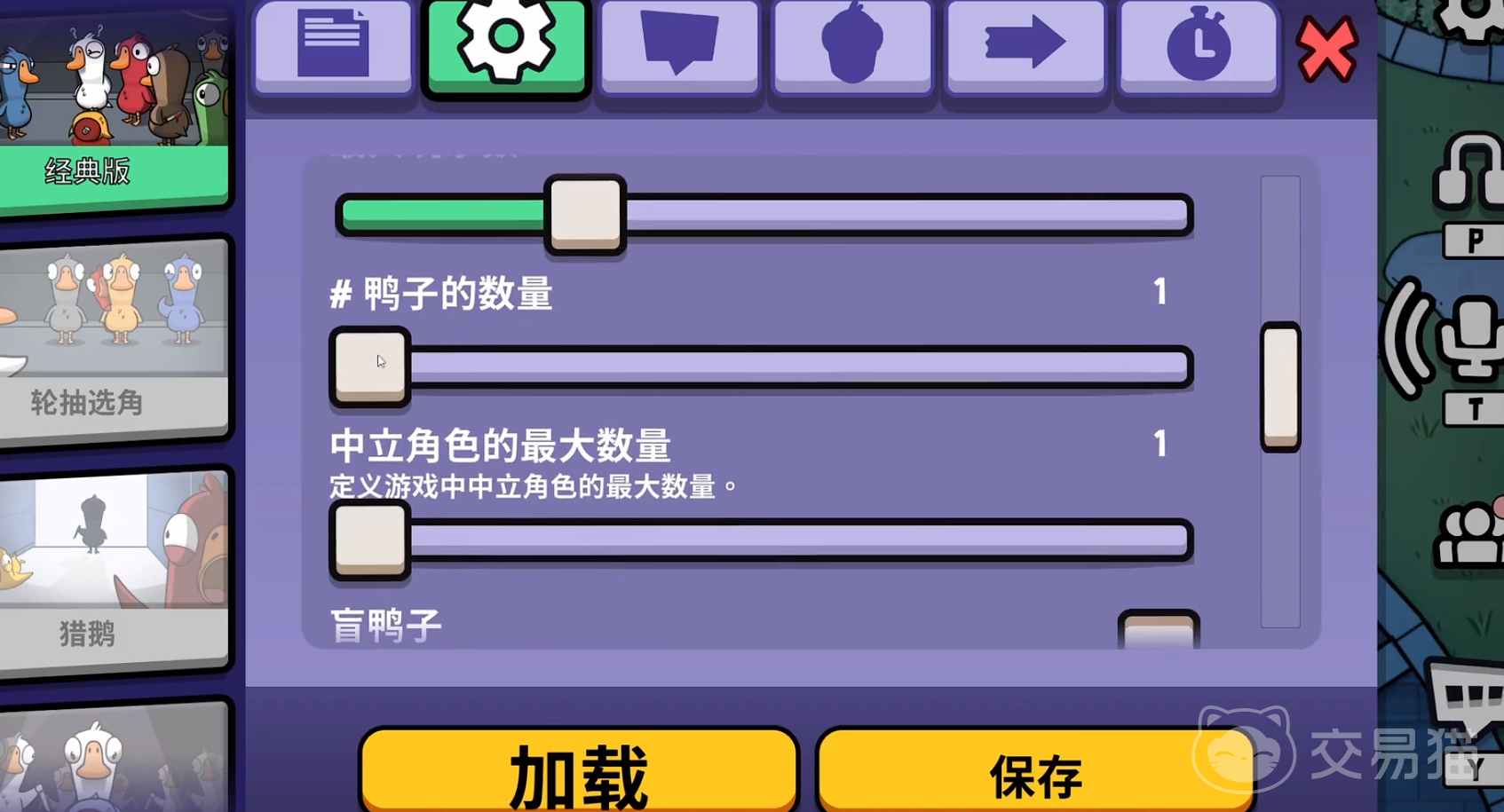 然后是房间内的角色设置,游戏分为三大阵营,好人阵营是鹅,坏人阵营是鸭,及中立阵营的其他角色,且每个阵营的角色都自带不同的技能,根据房间人数来合理安排不同阵营的角色可以保证游戏的平衡性。比如当游戏人数为8人的时候,可以设置2鸭1中立,当游戏人数为12人的时候,可以设置3鸭2中立。在阵营角色选择上,可以选择一些特殊技能的角色,比如鹅阵营的加拿大鹅,正义警长,肉汁等;鸭子阵营可以选择炸弹鸭,间谍鸭等,以增加游戏的策略性和多样性。