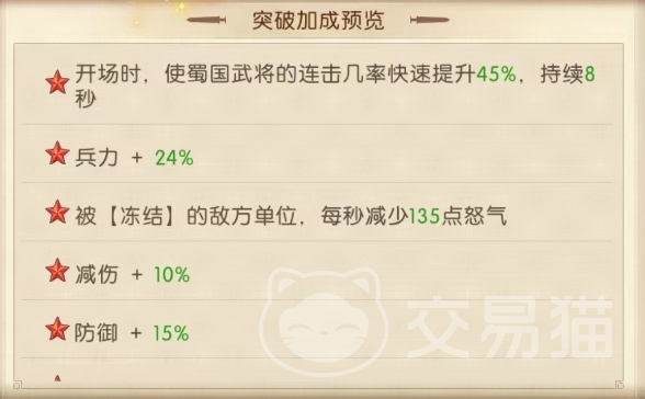 看破技能则是对寒风技能的强化升级,它使寒风的冻结时间延长2秒,增强了对敌方单位的控制时长,同时被冻结的敌方单位受到的技能伤害提高35%,这使得己方在敌方被冻结期间能够造成更高的输出伤害,从而更有可能在短时间内击败敌人,其实突破后的诸葛亮在开场时,能够使蜀国武将的连击几率迅速提升45%,这一效果持续8秒之久,在这一短暂而关键的时间窗口内,蜀国武将的攻击频率将得到提升。