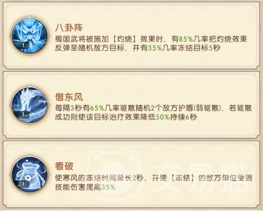 寒风技能则侧重于与蜀国队友的联动配合,当蜀国队友触发连击效果时,有65%的几率使目标陷入冻结状态达3.5秒,且被冻结的目标无法获得怒气,这一技能不仅增强了蜀国武将之间的协同作战能力,还能有效地限制敌方单位的怒气积累,八卦阵技能体现了诸葛亮的防御与反击策略,当蜀国武将被施加灼烧效果时,有85%的几率将此灼烧效果巧妙地反弹至随机敌方目标,并附带35%的几率使目标被冻结5秒,通过这种方式,诸葛亮能够将敌方施加给己方的负面效果转化为对敌人的反击手段。