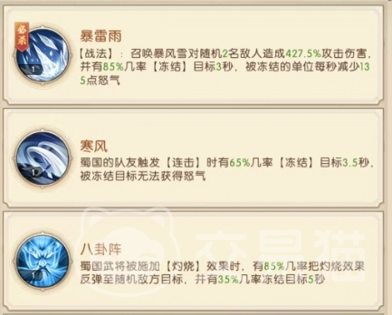 在这款游戏中的诸葛亮,技能暴雷雨作为他的战法,展现出强大的控制与伤害能力,诸葛亮召唤出如暴风雪之类的元素力量,随机对两名敌人造成高达427.5%的攻击伤害,同时该技能附带85%的高几率使目标陷入冻结状态长达3秒,被冻结的单位不仅行动受限,还会每秒减少135点怒气,延缓了敌人的技能释放节奏。