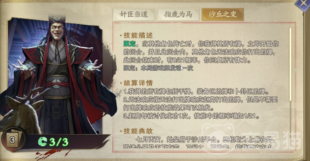 技能三叫做沙丘之变,堪称赵高最为恐怖的终极杀招,当战场上的局势陷入胶着,有队友不幸倒下之时,赵高便会掠夺其全部家当,无论是珍贵的手牌、强力的装备还是关键的卜卦牌全部夺走,紧接着他会开启暴走回合,此期间所有玩家都只能看着他出牌,当这个暴走回合结束时,赵高还有可能满血复活,所以建议这个时候大家最好是速战速决。