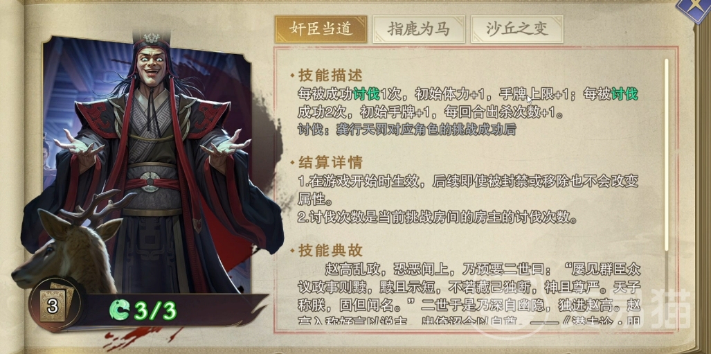 先来说说赵高的第一大技能奸臣当道,这可是一个非常棘手的技能,它具备越战越强的成长属性,随着战斗的持续进行,其威力会不断增强,每次赵高被击败后,就会激活一系列隐藏属性,这些隐藏属性分为不同的阶段,当第一次被讨伐成功后,他就会增加1点体力上限以及手牌上限,这意味着他在后续的战斗中将拥有更雄厚的生命储备和更多的手牌资源,并且手牌的选择也变得更加丰富。