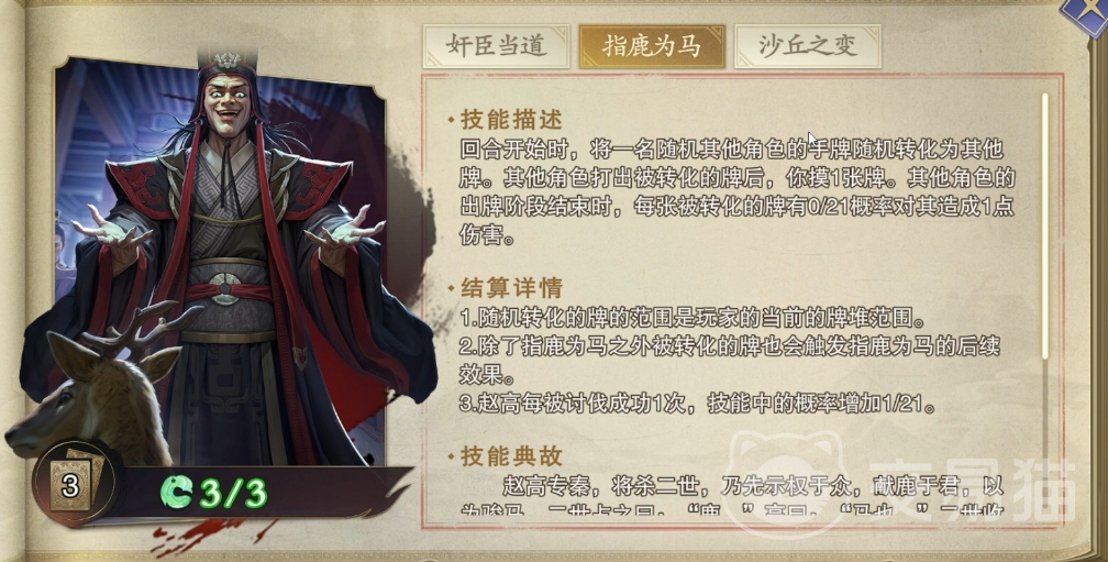 接下来要着重讲讲他的第二大技能叫做指鹿为马,这个技能属于卡牌陷阱的效果,在游戏开局之时,赵高就会对玩家们的手牌进行随机改造,当玩家在使用那些被魔改过的卡牌时,赵高便会从中摸取一张牌,从而扩充自己的手牌资源,到了后期赵高的优势便逐渐凸显出来,且这里每张被改造的卡牌它们都有一定概率在回合结束时反噬主人,不过破解这个效果的方法也是有的,只要玩家们在游戏过程中足够细心,注意观察卡牌变化提示,就会发现那些被改造的卡牌上会显示出特殊的标记,这些标记就是识破陷阱的关键线索,玩家们可以根据这些线索提前做好应对准备。