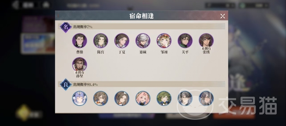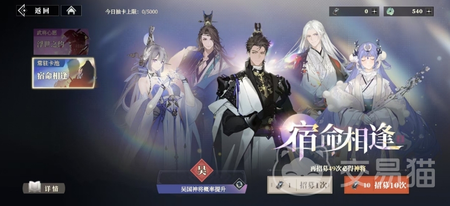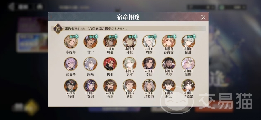 在常驻卡池宿命相逢中,当玩家发起招募时,不仅能收获100三山钱,还有机会将一名心仪的武将纳入麾下,就概率而言,神将的基础出现概率为1.6%,但游戏中贴心地设置了保底机制,使得神将的实际出现概率约提升至2.8%,名将的出现概率则相对较高,达到了7%,而良将的抽取概率更是令人惊喜,高达91.4%。为了全方位地保障玩家的利益,游戏还精心设立了保底规则。