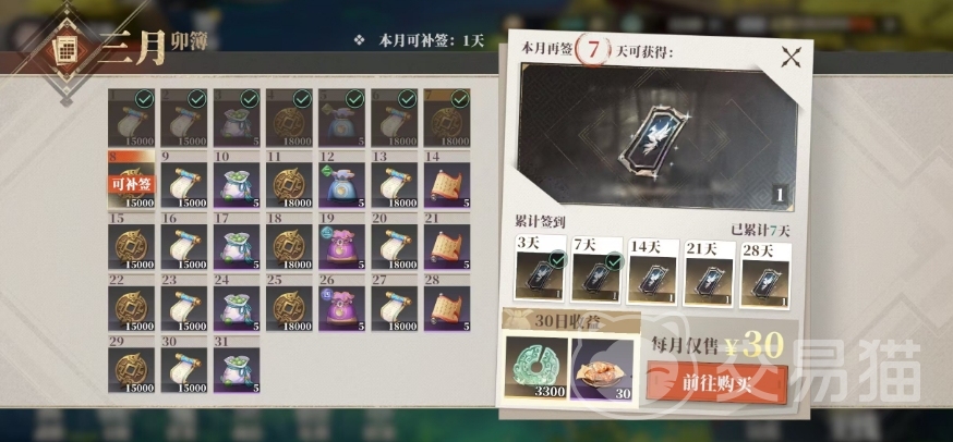 在卯簿这中每个月的14日、21日以及28日这几个特殊的日子里,只要玩家按时签到,就能额外获得韬略百战以及风物通用的碎片,这些碎片它们能够用来给紫色风物进行升星,除了这些基础的签到奖励之外,游戏还精心设置了连续签到奖励机制,如果玩家能够连续签到3天、7天、14天、21天或者28天的话,就可以分别获得1个常驻抽卡资源。