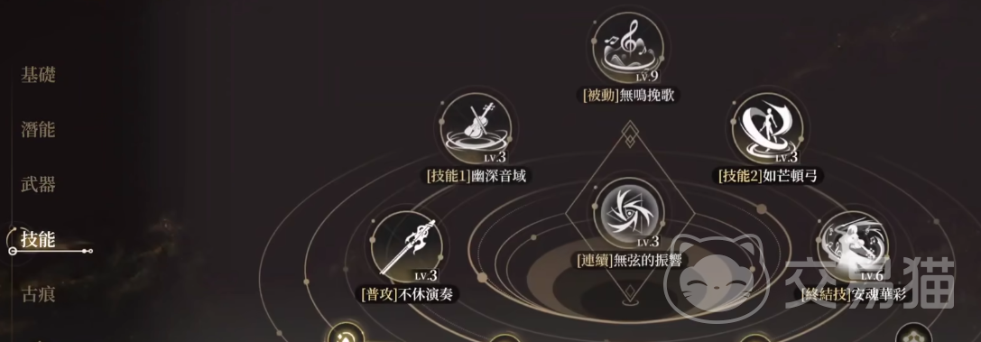 被动:无鸣挽歌。当上场之时同存在原调音域或者是离调音域,则可以进行余音扩散,对音域内敌人造成伤害,无论是哪种音域都可以造成53.35%的连携伤害。