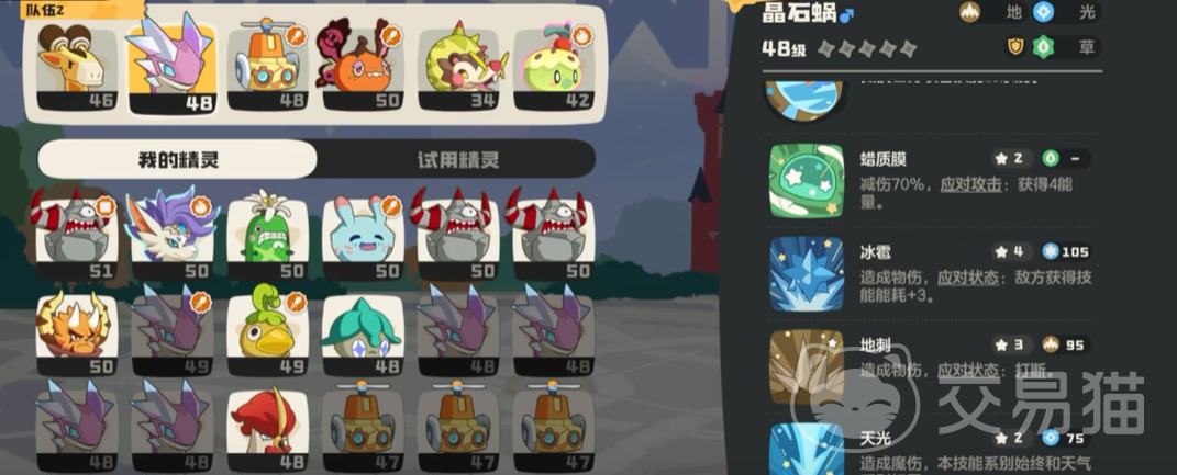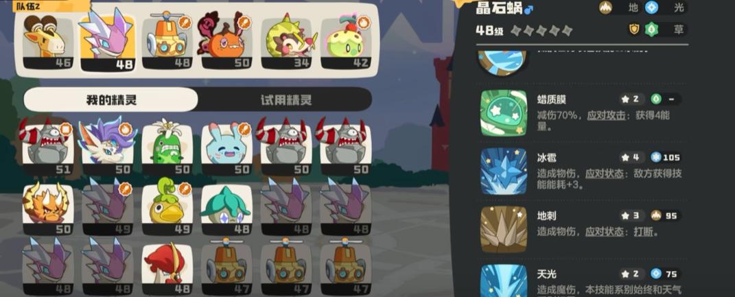 晶石蜗在选择性格时需要玩家选择可以增加生命以及物防和魔防这几方面的性格,技能携带蜡质膜、冰雹、地刺以及天光。