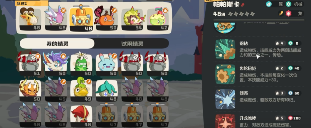 帕帕斯卡小编这里推荐大家选额固执这个性格,最好的选择增加生命和物攻以及物防或者是魔防性格,技能上面选择刚钻、齿轮扭矩、倾泻和升龙咆哮这四个技能,帕帕斯卡在携带技能这块小编要说的是大家一定要按照这个顺序来携带,否则刚钻的效果打不出来。