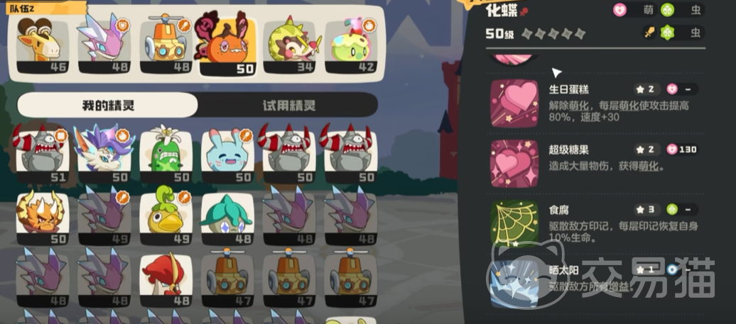 在属性上化蝶需要抓固执性格的精灵,这个性格可以增加魔攻魔防,技能上携带生日蛋糕、超级糖果、食腐以及晒太阳等技能。