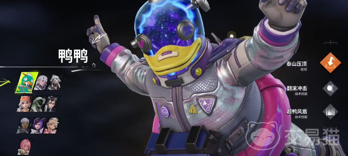 鸭鸭是攻防兼备的英雄,战术技可以让自己化身充气气球发起高速翻滚冲击,进入翻滚一段时间后还会自动换弹,滚动期间有减伤,并且再次使用该技能可以在经过之处生成加速气垫。鸭鸭还能召唤阻挡子弹和投掷物的风盾,在风盾后面自身的恢复速度也会得到加快。鸭鸭的大招泰山压顶则是高高跳起在空中蓄力后向下砸击地面,命中敌人的时候可以获得临时护盾,并且根据砸到的人数减少滚动技能的冷却时间。很明显鸭鸭就是那种适合在前线吸引火力,打乱敌方阵型的英雄。
