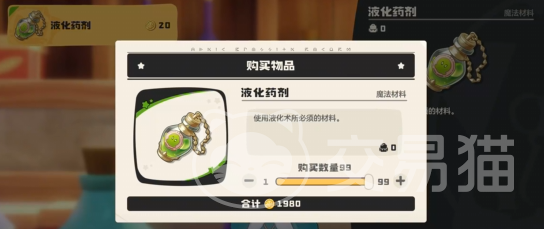 但这个时候得到的液化术是无法使用的,还需要一种材料才能使用,为了这一材料,我们先传送到商业街的炼金台,抵达后找到商业街的博得进行对话,购买好他这里的液化药剂就能使用了。