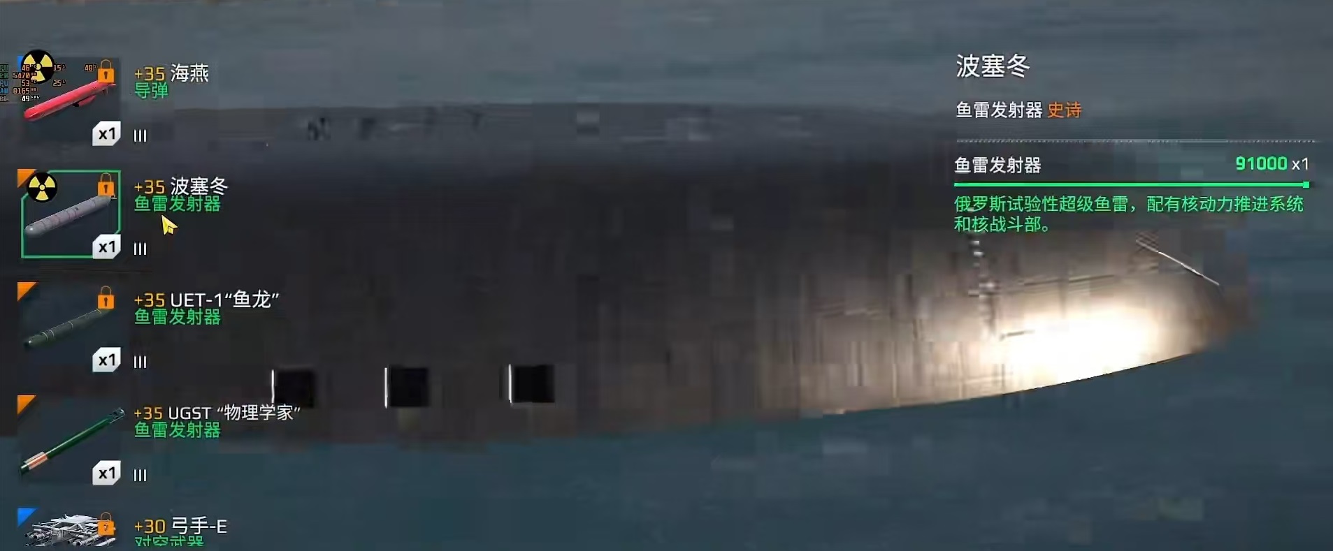 先来看下别尔哥罗德的基础数据,耐久方面40万左右,速度16.4节,从耐久和速度来看还是有着一定的优势,尤其是速度比俄亥俄要高一些,潜艇速度非常关键。其实这个潜艇令很多玩家认为它比较变态的地方,就在于它的各种核武器,包括波塞冬鱼雷发射器,海燕导弹等,这些都是非常有特点的地方。