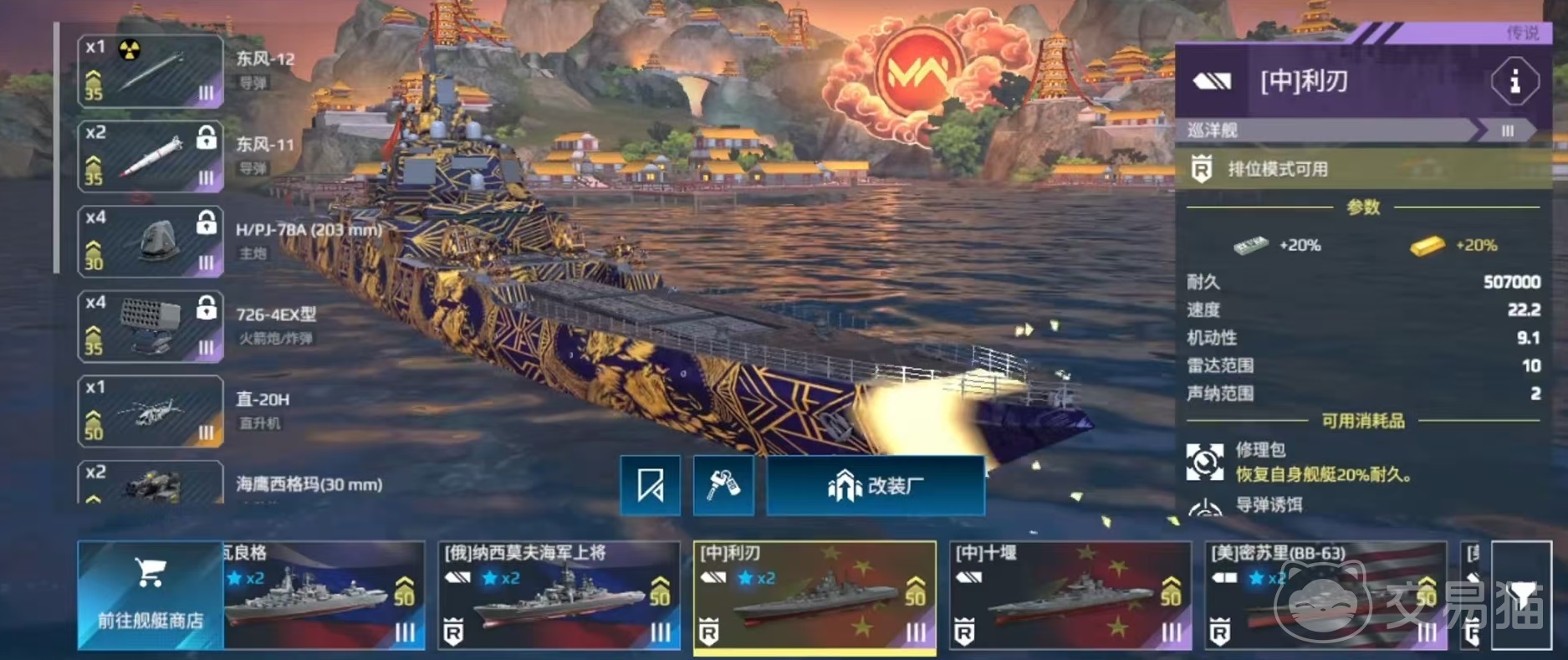 利刃巡洋舰在推出之后经过了多个版本更迭,从目前来看,强度还是比较可观的。在锁定武器方面,拥有着东风11反舰导弹,伤害非常不错,但是装填时间比较长,所以实战效果打了一些折扣。还有一样武器是电磁主炮,这个电磁主炮各项数值都比较出色,是利刃的重要输出来源。最后一个是锁定电磁火箭炮,电磁火箭炮拥有着较强的属性,在实战中和主炮配合打出稳定的强制伤害。