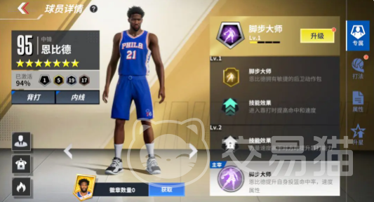 恩比德司职中锋,拥有多种不一样的技能,例如有内线,还有背打标签。专属技能还可以大幅度的提升命中的几率,还有速度,可以有效增强突破时的过人能力。专属的动作还可以让他拥有一个比较敏捷的后卫动作包。主宰技能可以迅速地提升自身的速度以及投篮的命中几率。